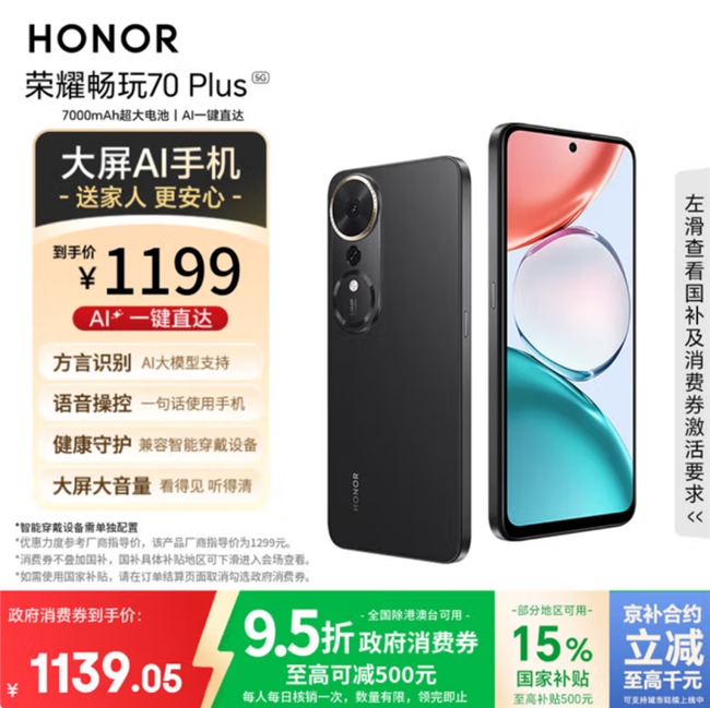 京東大屏AI手機(jī)榮耀暢玩70 Plus是京東聯(lián)合榮耀,通過C2M反向定制模式,打造的首款大屏AI手機(jī)。手機(jī)側(cè)面配備了實(shí)體AI鍵,清理加速、調(diào)整亮度、掃一掃等常用功能一鍵搞定;可以用語音點(diǎn)外賣、買藥、買菜,手機(jī)會(huì)自動(dòng)跳轉(zhuǎn)到京東APP完成搜索,消費(fèi)者可以直接下單。AI語音還可識(shí)別方言,即使不太會(huì)說普通話,也能用AI語音方式完成操作。這款手機(jī)京東11.11享政企雙補(bǔ)至高直降60元,到手至低1139元,還享3期免息補(bǔ)貼,送家人更安心。