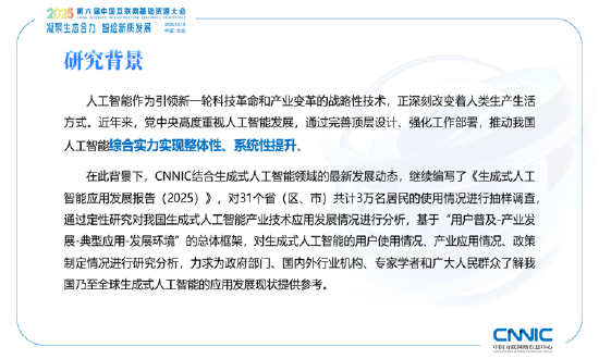10月18日,中國互聯(lián)網(wǎng)絡信息中心(CNNIC)在2025(第六屆)中國互聯(lián)網(wǎng)基礎資源大會上發(fā)布《生成式人工智能應用發(fā)展報告(2025)》(以下簡稱《報告》)。中國互聯(lián)網(wǎng)絡信息中心副主任張曉對《報告》進行了發(fā)布與解讀。