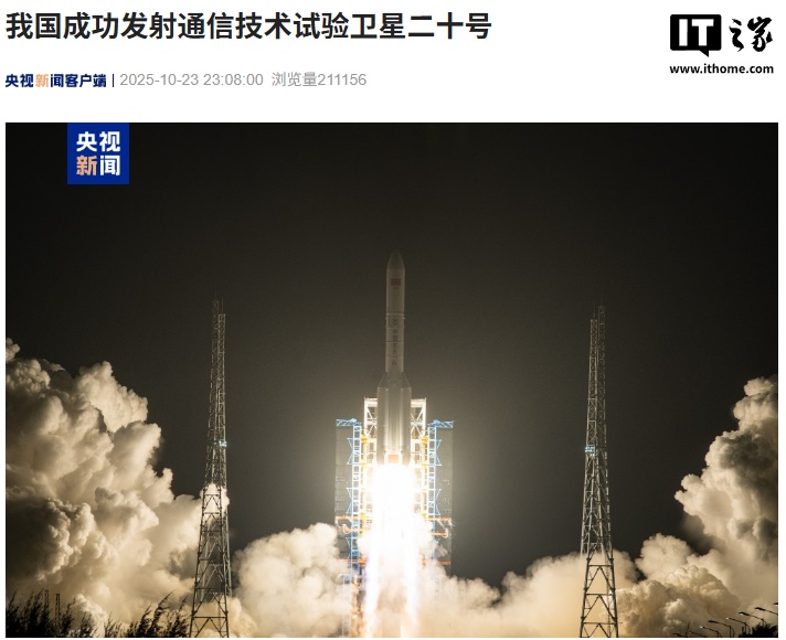 10 月 23 日消息,據(jù)央視新聞報道,北京時間 2025 年 10 月 23 日 22 時 30 分,我國在文昌航天發(fā)射場使用長征五號運載火箭,成功將通信技術(shù)試驗衛(wèi)星二十號發(fā)射升空,衛(wèi)星順利進(jìn)入預(yù)定軌道,發(fā)射任務(wù)獲得圓滿成功。該衛(wèi)星主要用于開展多頻段、高速率衛(wèi)星通信技術(shù)驗證。