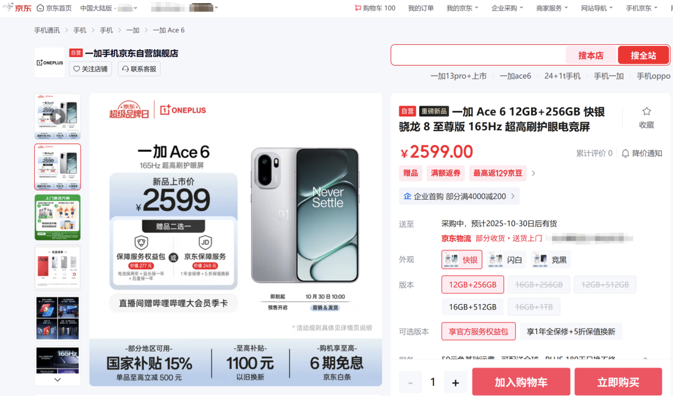 京東先人一步下單一加 Ace 6可享限量權(quán)益隨心選,包括價值277元保障權(quán)益包(含電池保兩年+延長保一年+后蓋保一年)、價值249元京東保障服務(wù)(含1年全保修+5折保值換新),兩項(xiàng)權(quán)益可任選其一。來京東參與一加 Ace 6預(yù)售,部分地區(qū)享國補(bǔ)到手價2209.15元起,還可享6期免息、以舊換新至高補(bǔ)貼1100元、曬單贏30元京豆、贈新機(jī)權(quán)益禮包、直播間贈嗶哩嗶哩大會員季卡、直播間限量贈有線耳機(jī)、即日起至11月11日直播間整點(diǎn)抽無畏契約官方正版周邊等福利。