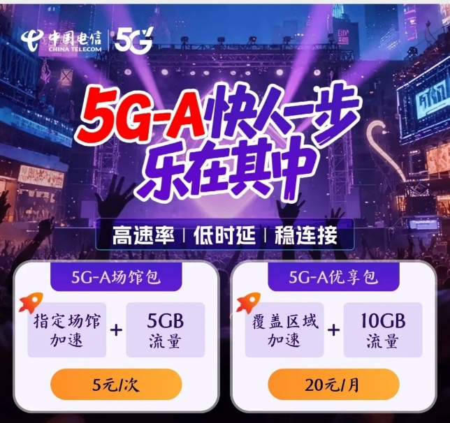 電信5G-A場(chǎng)館包按次訂購(gòu),內(nèi)含5G通用流量,并且已覆蓋江蘇省13地市各大場(chǎng)館,看演唱會(huì)、音樂(lè)節(jié),隨訂隨用。同時(shí)江蘇電信還貼心推出的20元10GB優(yōu)享月包,讓你用一杯奶茶錢,即可享受一個(gè)月5G-A極速服務(wù),還附帶全國(guó)通用大流量。 用“小小疊加包“,實(shí)現(xiàn)”體驗(yàn)大升級(jí)”。 讓你無(wú)論在網(wǎng)絡(luò)上做什么,都快人一步,樂(lè)在其中。