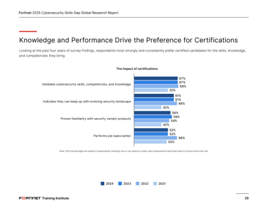 面對持續(xù)存在的人才短缺困境,專業(yè)認證的價值持續(xù)獲得業(yè)界認可。89%的IT決策者更傾向于雇用持有專業(yè)認證的候選人,認為認證能有效驗證知識儲備(67%)、體現技術適應能力(61%)并證實對關鍵工具的熟練度(56%)。然而,與此趨勢相悖的是,企業(yè)對認證資助的投入在2024年出現縮減,僅有73%的受訪者表示愿意為員工支付認證費用,低于2023年的89%。