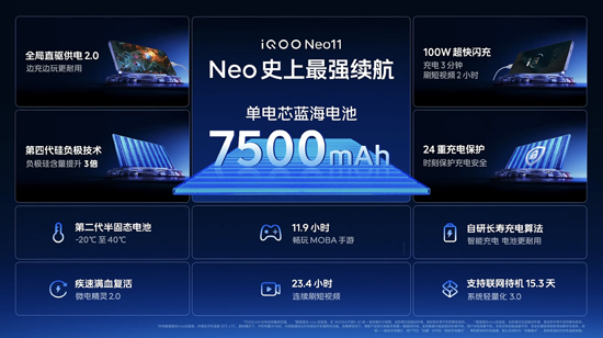 iQOO Neo11內(nèi)置7500mAh 超薄藍(lán)海電池,采用第二代半固態(tài)與第四代硅負(fù)極技術(shù),能量密度達(dá) 849Wh/L,-20℃極寒環(huán)境仍能穩(wěn)定供電。搭配 100W 超快閃充,實現(xiàn) “充電 3 分鐘,抖音 2 小時” 的回血速度,全局直驅(qū)供電 2.0 技術(shù)可智能溫控,邊充邊玩不燙手。​