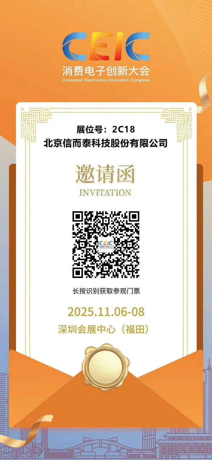 北京信而泰科技股份有限公司誠摯邀請(qǐng)您蒞臨 2025消費(fèi)電子創(chuàng)新大會(huì)(CEIC 2025) ,與我們共同探索消費(fèi)電子領(lǐng)域的前沿技術(shù)與創(chuàng)新應(yīng)用。本次大會(huì)將于 2025年11月6日至8日 在 深圳會(huì)展中心(福田)2號(hào)館 隆重舉行,我司展位號(hào)為 2C18,期待與您相見!