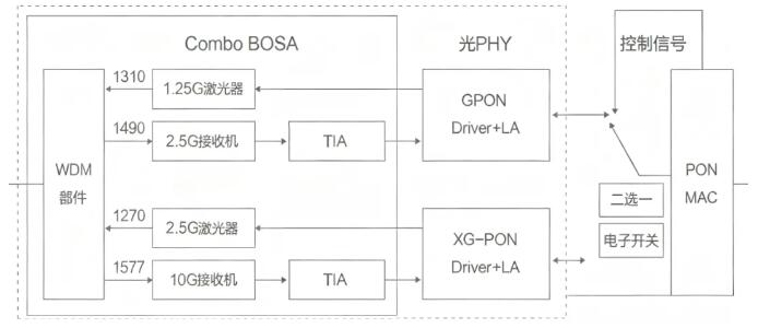 我們首先簡單來看一下Combo FTTR器件技術(shù):與傳統(tǒng)GPON BOSA或10G PON BOSA相比,F(xiàn)TTR+上聯(lián)接口BOSA通過內(nèi)部WDM將收發(fā)功能進(jìn)行合分波集成,形成小型化Combo光器件。這種設(shè)計(jì)優(yōu)化了器件結(jié)構(gòu),提高了集成度。同時(shí),BOB方案的應(yīng)用使得光PHY與MAC直接相連,簡化了信號處理流程。一個(gè)Combo PON BOSA同時(shí)包含了GPON和10G PON的兩個(gè)物理通道,為FTTR主設(shè)備提供了豐富的物理接口選擇。