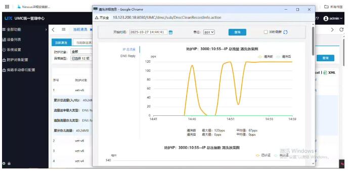 3.測試儀表發(fā)送1Gbps的混合攻擊報文,攻擊類型包括:NTP反射攻擊、Memcached反射攻擊、SSDP反射攻擊、CLDAP反射攻擊、DNS反射攻擊。攻擊和背景流量的源地址不重疊,攻擊的目的地址為背景流量部分目的IP,攻擊發(fā)送持續(xù)時間10分鐘。