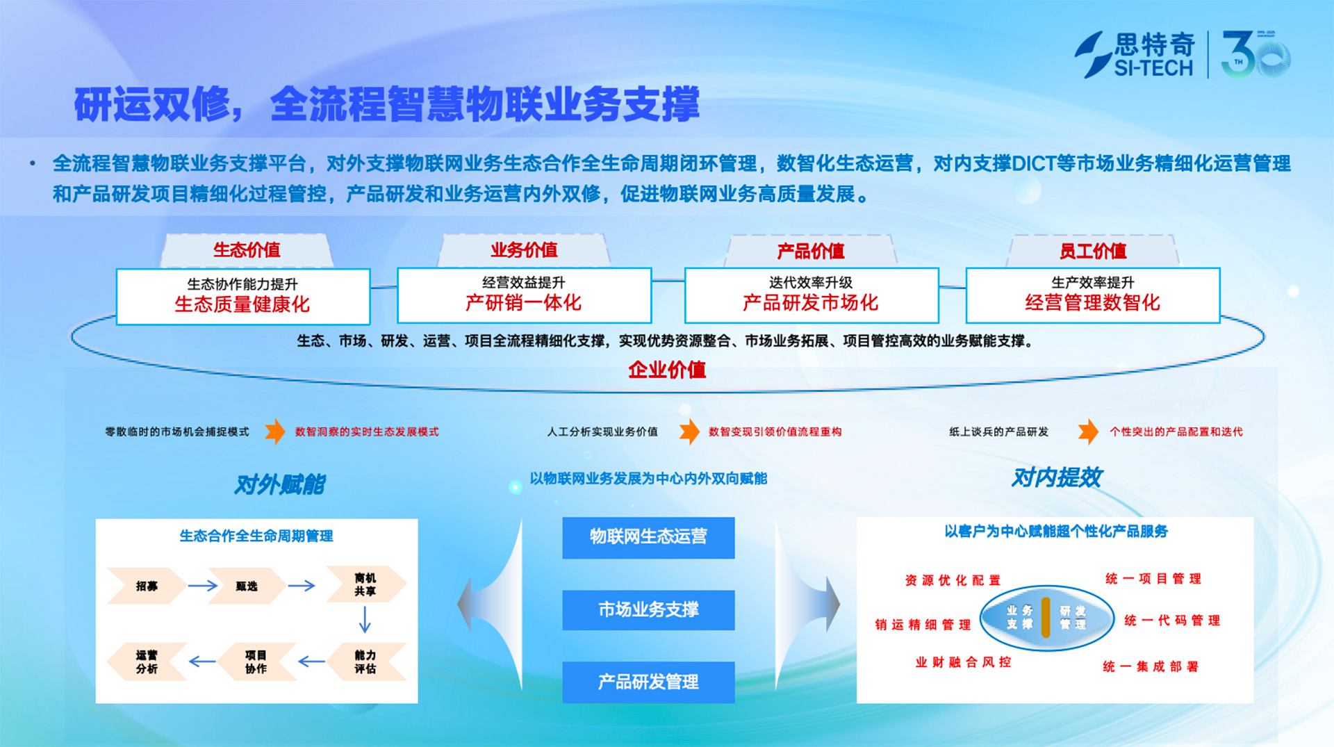 思特奇運營商物聯(lián)支撐平臺以“設(shè)備-數(shù)據(jù)-AI-應(yīng)用-安全”為核心脈絡(luò),精準聚焦運營商及中大型物聯(lián)網(wǎng)企業(yè)需求,對外實現(xiàn)物聯(lián)網(wǎng)業(yè)務(wù)生態(tài)合作全生命周期閉環(huán)管理,以數(shù)智化手段賦能生態(tài)高效運營;對內(nèi)支撐DICT等市場業(yè)務(wù)精細化運營與產(chǎn)品研發(fā)項目全流程管控,通過“產(chǎn)品研發(fā)與業(yè)務(wù)運營”內(nèi)外雙修,助力企業(yè)實現(xiàn)“生態(tài)質(zhì)量健康化、產(chǎn)研銷一體化、經(jīng)營管理數(shù)智化”的核心價值,全面驅(qū)動物聯(lián)網(wǎng)業(yè)務(wù)高質(zhì)量發(fā)展。