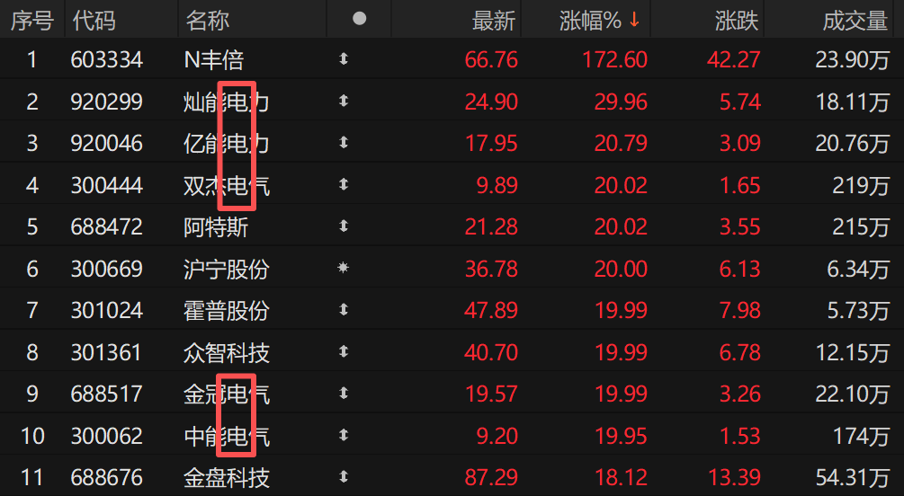 電力設(shè)備概念股集體爆發(fā),包括雙杰電氣(9.890, 0.00, 0.00%)、特變電工(24.110, 0.00, 0.00%)、保變電氣(9.910, 0.00, 0.00%)、太陽電纜(7.240, 0.00, 0.00%)在內(nèi)共計十余股漲停?v觀今日漲幅榜,多只證券簡稱中含有“電”字的個股位居前列。