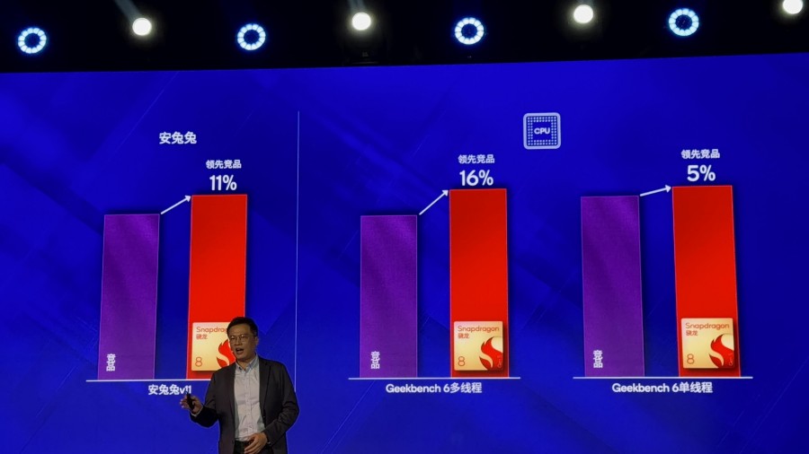 另外,與競(jìng)品相比,第五代驍龍8安兔兔分?jǐn)?shù)領(lǐng)先11%,Geekbench 6多線程分?jǐn)?shù)領(lǐng)先16%,單線程分?jǐn)?shù)也領(lǐng)先競(jìng)品5%。在CPU多線程能效的部分,第五代驍龍8和競(jìng)品相比,達(dá)到相同峰值性能的情況下,功耗領(lǐng)先36%;而在功耗相同的情況下,性能領(lǐng)先12%。
