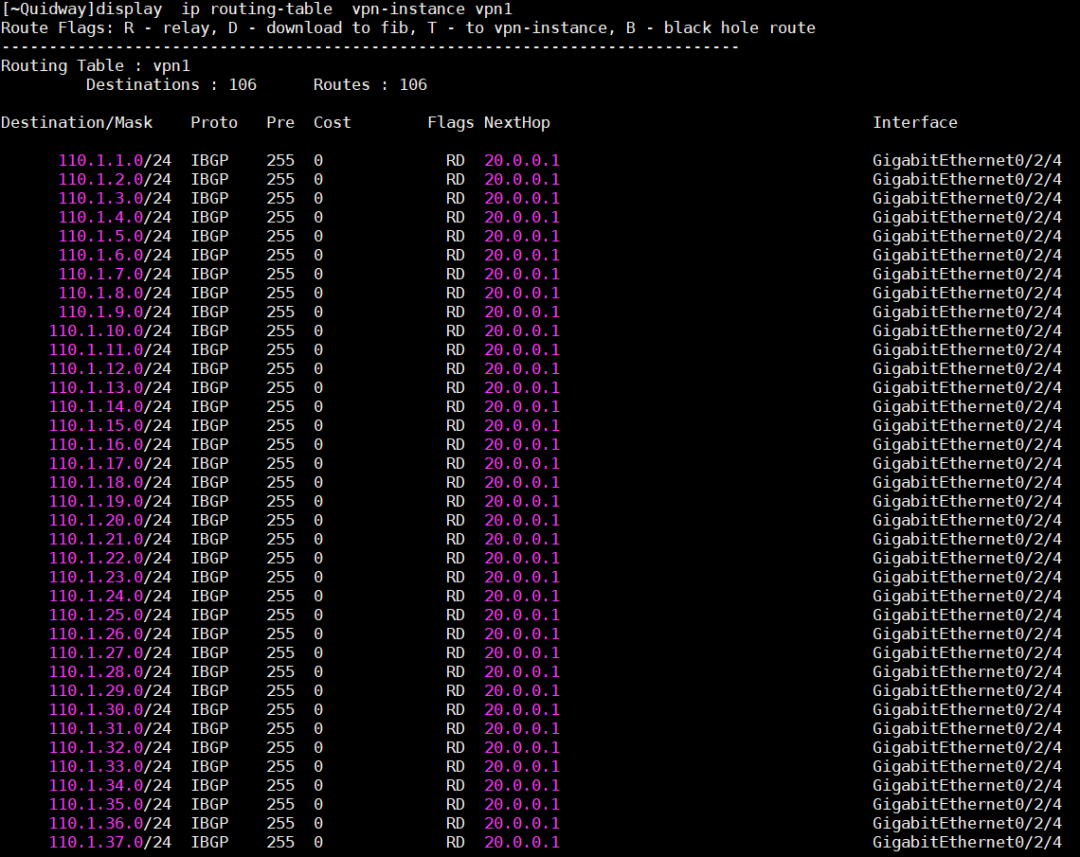 在DUT上檢查,共1000個(gè)VPN數(shù)量、VPN中通告100條私網(wǎng)路由,VPN路由總數(shù);