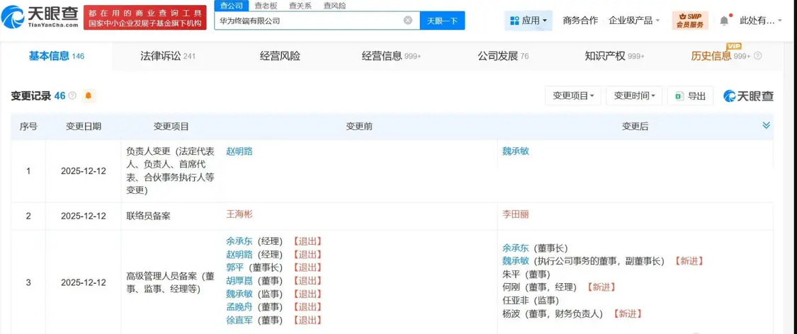 12月16日,天眼查工商信息顯示,近日,華為終端有限公司發(fā)生工商變更,原董事長郭平卸任,由余承東接任董事長一職,多位高管職務發(fā)生變更。