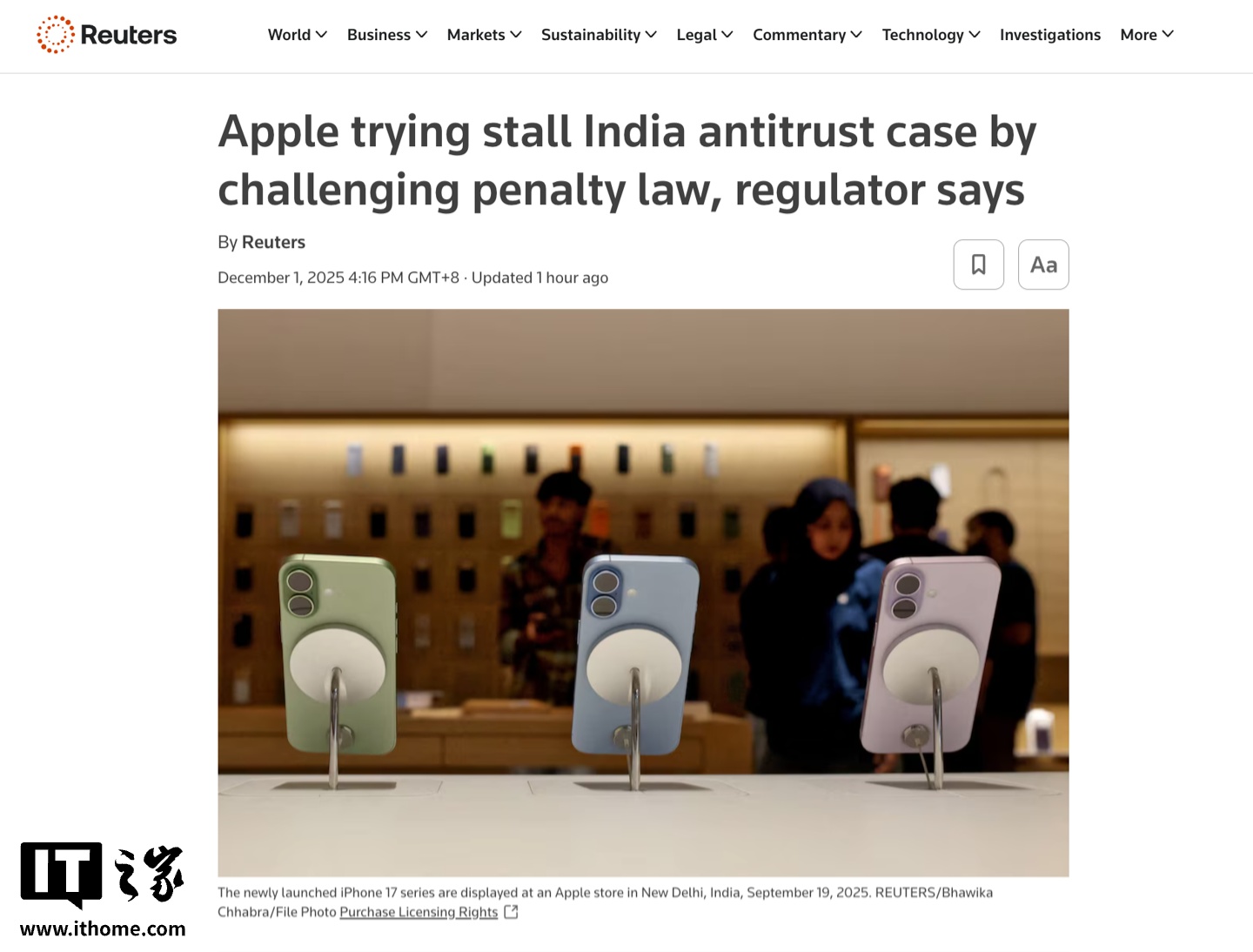 12 月 1 日消息,據(jù)路透社今日報(bào)道,印度反壟斷監(jiān)管機(jī)構(gòu)向新德里法院表示,蘋果試圖通過質(zhì)疑印度的反壟斷罰款制度來拖延相關(guān)調(diào)查。