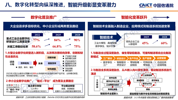 數(shù)字化發(fā)展正從普及推廣邁向智能化變革躍升階段。在數(shù)字化領(lǐng)域,工業(yè)企業(yè)數(shù)字化研發(fā)工具普及率與關(guān)鍵工序數(shù)控化率持續(xù)攀升。大企業(yè)從單純效率改善轉(zhuǎn)向效率創(chuàng)新與韌性多目標(biāo)優(yōu)化;中小企業(yè)則形成“鏈?zhǔn)?平臺(tái)”發(fā)展路徑,鏈?zhǔn)揭源髱,平臺(tái)依托數(shù)據(jù)與資源賦能驅(qū)動(dòng)轉(zhuǎn)型。智能化變革由工業(yè)大模型和機(jī)身智能技術(shù)驅(qū)動(dòng),預(yù)計(jì)未來(lái)三年領(lǐng)先工業(yè)AI滲透率達(dá)60%。AI與制造業(yè)全過(guò)程、全系統(tǒng)深度融合,催生出零缺陷制造、可重構(gòu)制造等自主化新模式,還實(shí)現(xiàn)從AI嵌入式到AI原生的演進(jìn),以基礎(chǔ)模型、數(shù)字孿生和工業(yè)智能體為體系推動(dòng)制造系統(tǒng)迭代升級(jí)。