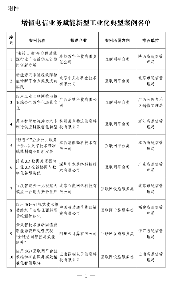 飛象網(wǎng)訊(致新/文)12月31日消息,工信部信息通信管理局發(fā)文稱,根據(jù)《工業(yè)和信息化部辦公廳關(guān)于開展增值電信業(yè)務(wù)賦能新型工業(yè)化典型案例征集工作的通知》,經(jīng)企業(yè)自主申報(bào)、地方推薦、專家評(píng)審和復(fù)核,現(xiàn)將評(píng)選出的增值電信業(yè)務(wù)賦能新型工業(yè)化典型案例進(jìn)行公示,請(qǐng)社會(huì)各界監(jiān)督。如有異議,請(qǐng)于公示期內(nèi)提出書面反饋意見,并明確提出異議的事實(shí)依據(jù)、真實(shí)姓名、工作單位和聯(lián)系方式等。
