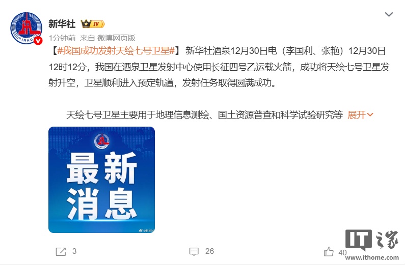 12 月 30 日消息,據(jù)新華社報(bào)道,12 月 30 日 12 時(shí) 12 分,我國在酒泉衛(wèi)星發(fā)射中心使用長征四號(hào)乙運(yùn)載火箭,成功將天繪七號(hào)衛(wèi)星發(fā)射升空,衛(wèi)星順利進(jìn)入預(yù)定軌道,發(fā)射任務(wù)取得圓滿成功。