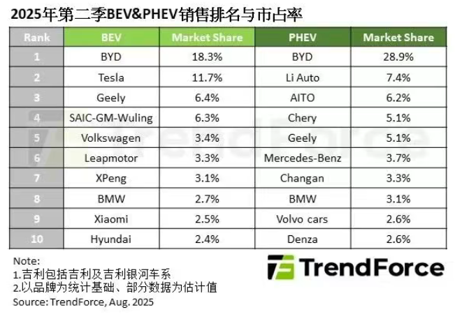 其中,純電車(BEV)銷量達(dá) 328 萬(wàn)輛,年增 39%。報(bào)告稱,比亞迪以 18.3% 的市占率穩(wěn)居 BEV 最大品牌,銷量年增率高達(dá) 43%。特斯拉雖維持市占第二名,但在中國(guó)、北美、西歐等市場(chǎng)表現(xiàn)衰退,即便于韓國(guó)、挪威和土耳其有所成長(zhǎng),也難以彌補(bǔ)主要市場(chǎng)的下滑幅度,導(dǎo)致第二季整體銷量年減約 14%。