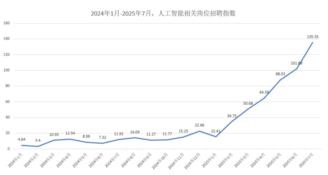 薪資水平的飆升,成為企業(yè)吸引人才的核心籌碼。2025 年 7 月,AI 相關(guān)崗位招聘薪資下限均值達(dá)到 4.7 萬(wàn)元 / 月,較 2024 年 1 月上漲 14.16%;薪資上限均值則升至 7.8 萬(wàn)元 / 月,同比漲幅 8.98%。即便是實(shí)習(xí)崗位,部分 AI 實(shí)習(xí)生日薪可達(dá) 4000 元,這一收入遠(yuǎn)超多數(shù)行業(yè)正式員工的月薪,用 “重金挖人” 形容毫不為過(guò)。