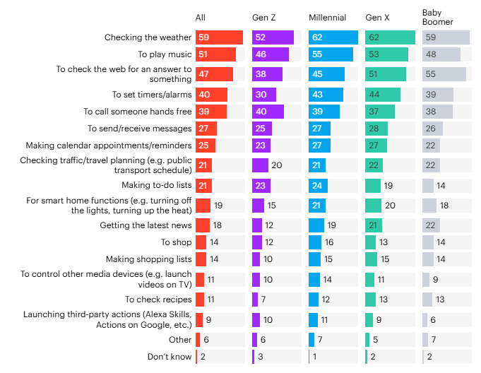 IT之家注意到,調(diào)查結(jié)果顯示,人們使用智能助手的主要用途集中在以下五個(gè)基本類別: