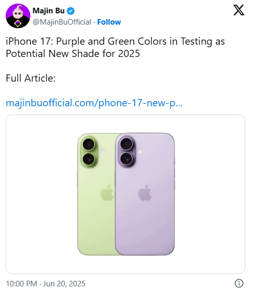 此外,iPhone 17 或推出新配色:紫色與綠色。