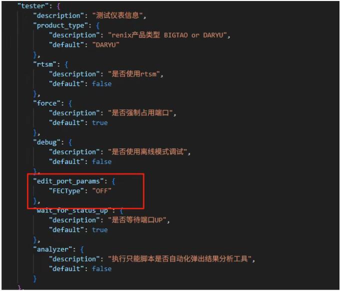 測試儀表產(chǎn)品類型分為BigTao和DarYu,不同端口速率的適配,在testbed.json文件中修改"edit_port_params"可以對測試儀的端口參數(shù)進行設(shè)置,如下圖示為端口設(shè)置關(guān)閉FEC。