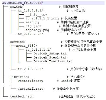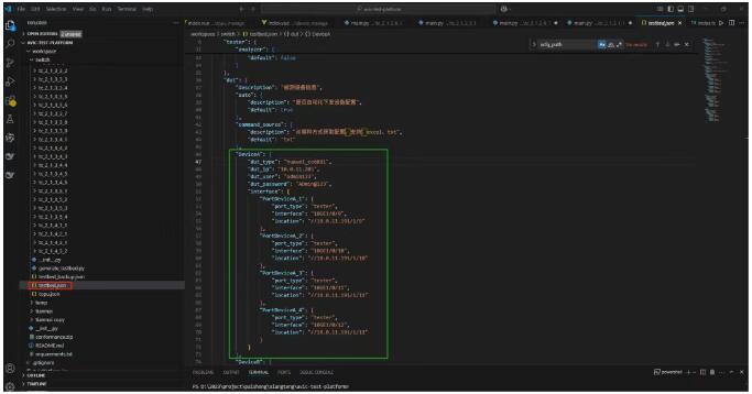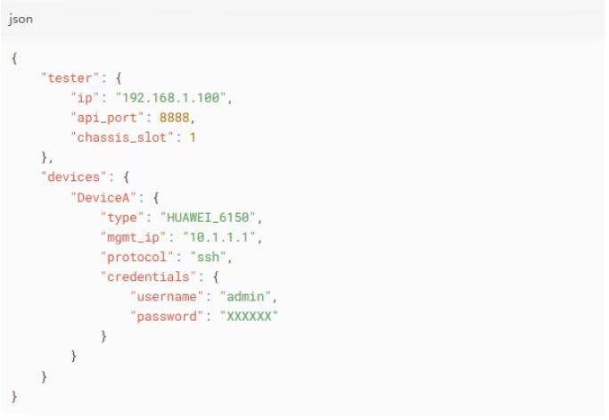 測試拓撲連接信息寫入testbed.json文件中,修改對應(yīng)的測試儀表,交換機設(shè)備的 ip 和實際端口即可適配不同的測試環(huán)境。