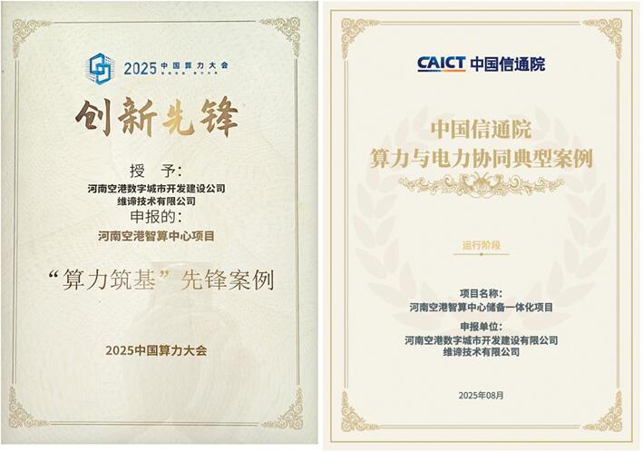 大會(huì)期間,主辦方揭曉了備受業(yè)界矚目的相關(guān)評選結(jié)果。河南空港數(shù)字城市開發(fā)建設(shè)有限公司與維諦技術(shù)(Vertiv)聯(lián)合申報(bào)的“河南空港智算中心項(xiàng)目”,榮膺“創(chuàng)新先鋒優(yōu)秀成果獎(jiǎng)”、“典型智算項(xiàng)目案例”兩項(xiàng)殊榮。