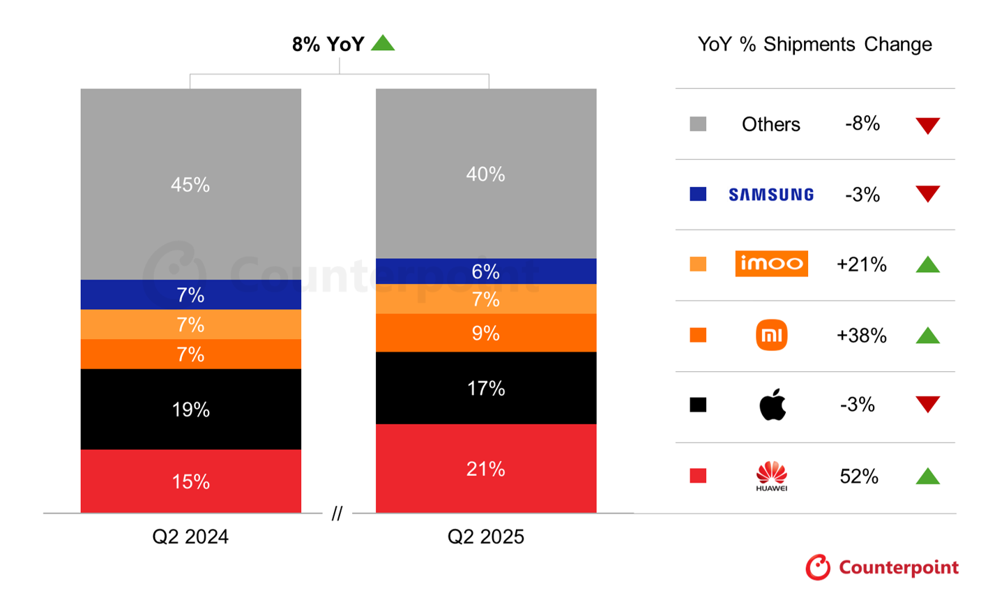 憑借其多樣化的產(chǎn)品組合、強(qiáng)勁的國(guó)內(nèi)勢(shì)頭以及中高端產(chǎn)品具有競(jìng)爭(zhēng)力的價(jià)格,華為首次超越蘋果,成為全球出貨量的頭把交椅。