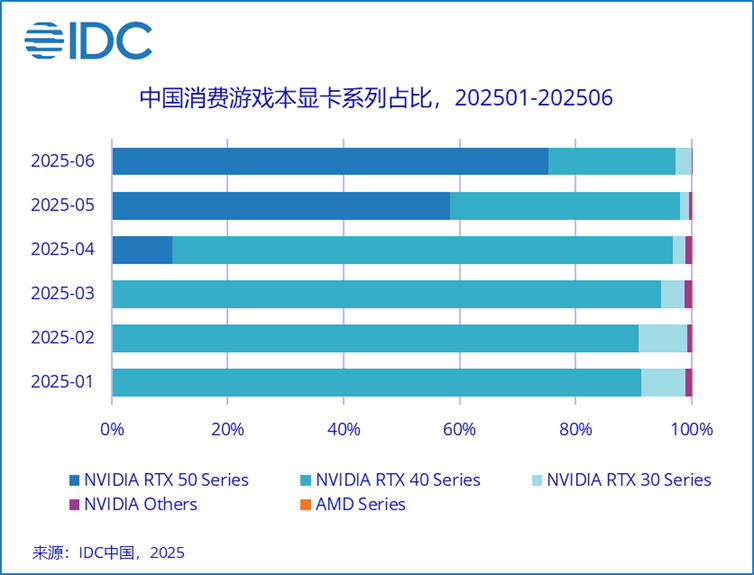 此外,英偉達 RTX 50 系顯卡也成為市場換機潮的重要推手。IDC 月度銷售市場跟蹤報告顯示,RTX 50 系顯卡在上市數(shù)月后就占據(jù)了 60% 的市場份額;在 2025 年 6 月,消費級游戲本中有 75.3% 的銷量來自搭載 RTX 50 系列的產(chǎn)品。