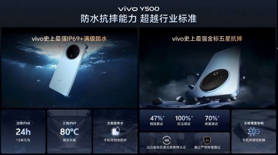 在防水能力上,vivo Y500實現(xiàn)了里程碑式的跨越,擁有vivo史上最強IP68/69/69+滿級防水。在金剛磐石架構(gòu)的加持下,vivo Y500具備同檔領(lǐng)先的抗摔能力,產(chǎn)品通過了SGS金標(biāo)五星抗跌耐摔等兩大認證。實測中,vivo Y500從7cm高度6.2萬次屏幕跌落后,手機無損且功能正常使用。