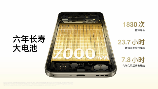 續(xù)航方面,A6 Pro 搭載 OPPO 最大的 7000mAh 大電池,輕松實現(xiàn)“一充用一天”,配合 80W 超級閃充,可快速補足電量,覆蓋用戶從早到晚的重度使用場景,徹底告別電量焦慮。擁有 1830 次超長壽循環(huán)壽命,六年長壽,刷新耐用新記錄。