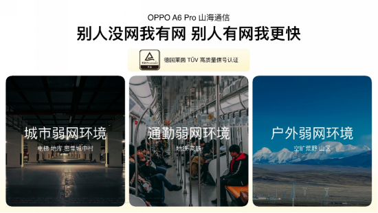 OPPO A6 Pro 采用旗艦級山海通信全套解決方案,帶來行業(yè)最強弱網(wǎng)通信體驗。針對地庫、電梯、山區(qū)等信號薄弱場景,山海射頻天線通過天線設(shè)計革新,低頻信號收發(fā)能力提升 200%,整體信號強度達(dá)前代 2 倍。即使在完全無信號環(huán)境下,A6 Pro 還可通過藍(lán)牙與其它 OPPO 手機進(jìn)行通信,支持語音、文字及圖片傳輸,成為戶外應(yīng)急的“保底”聯(lián)絡(luò)工具。