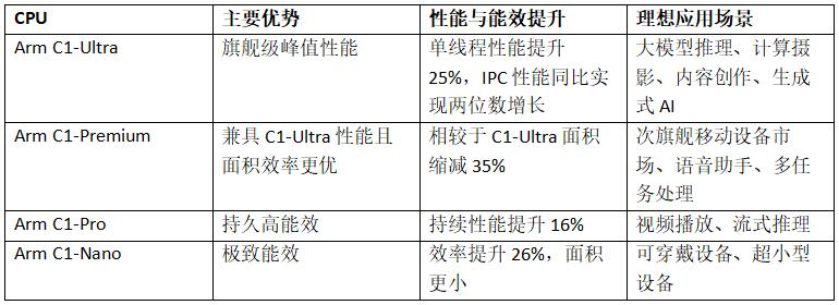 •  新一代搭載 SME2 技術(shù)的 Armv9.3 CPU 集群:包括 Arm C1-Ultra 和 Arm C1-Pro,為旗艦設(shè)備提供支持