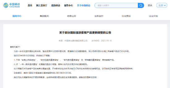 中國(guó)移動(dòng):9月16日起,對(duì)部分國(guó)際漫游套餐產(chǎn)品實(shí)施調(diào)整