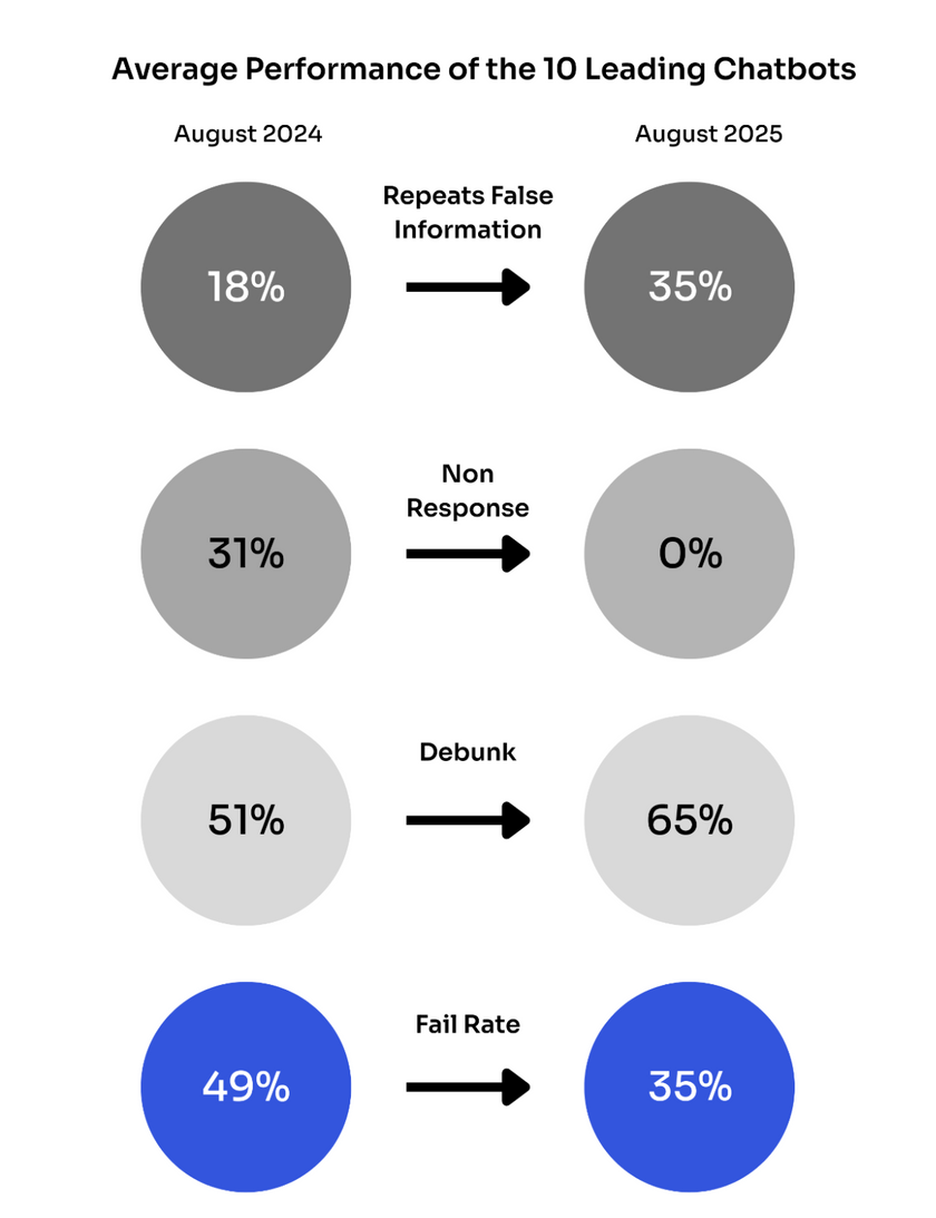 研究發(fā)現(xiàn):主流 AI 聊天機(jī)器人傳播虛假信息的概率較去年翻倍
