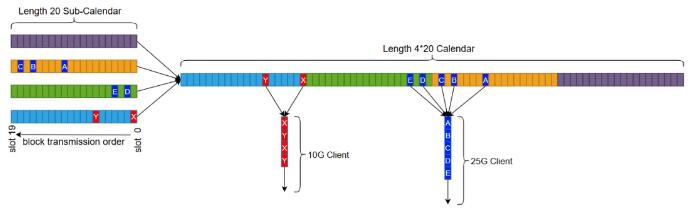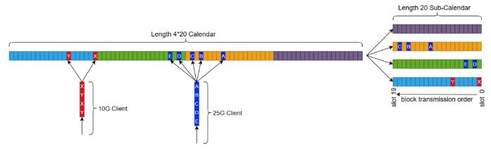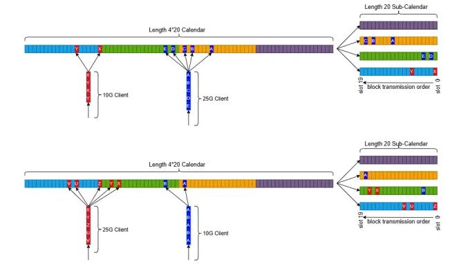 FlexE Shim 時隙配置,通過 Calendar 機(jī)制,為每個Client接口提供靈活、動態(tài)可調(diào)的配置。不同速率的Client接口,F(xiàn)lexE Shim將其業(yè)務(wù)數(shù)據(jù)按5G的顆粒度,靈活分配到業(yè)務(wù)承載通道上,實現(xiàn)多種速率接口靈活復(fù)用。