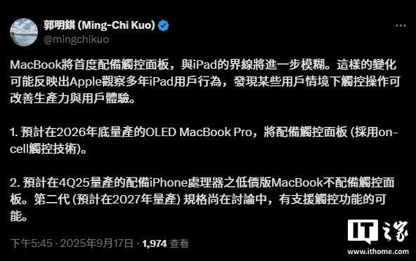 IT之家注意到,郭明錤稱,預(yù)計在 2026 年底量產(chǎn)的 OLED MacBook Pro 將配備觸控面板。預(yù)計在今年四季度量產(chǎn)的配備 iPhone 處理器之低價版 MacBook 不配備觸控面板。第二代規(guī)格尚在討論中,有支持觸控功能的可能。