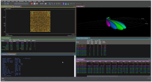 要測試大規(guī)模多輸入多輸出無線電單元,需要具備:O-DU模擬器,配備通過以太網(wǎng)接口生產(chǎn)、播放、捕獲和測量O-RAN流量的工具;多射頻收發(fā)器,用于在不同方向上產(chǎn)生帶有噪聲和干擾的波束,并同時接收信號。測試裝置不僅需要測量上行和下行鏈路方向的所有波束和信號,還需要能夠精確定位波束賦形問題。圖4顯示了帶幅度和相位權(quán)重的下行鏈路波束賦形示例,以及相應(yīng)的波束模式和EVM數(shù)據(jù)。