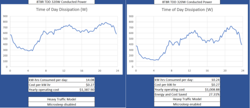 O-RU是接入網(wǎng)中功耗最高的組件。不過,可以通過多種手段實現(xiàn)節(jié)能,例如可變時鐘、動態(tài)功率放大器偏置、小區(qū)和載波關(guān)閉、射頻信道重新配置、睡眠模式、間斷收發(fā)等。隨著RAN的分解,需要明確各組件特性,以全面了解系統(tǒng)和網(wǎng)絡(luò)層面的權(quán)衡。圖5對比展示了啟用和未啟用微睡眠模式時,O-RU站點在24小時內(nèi)的功耗以及潛在的節(jié)能效果。