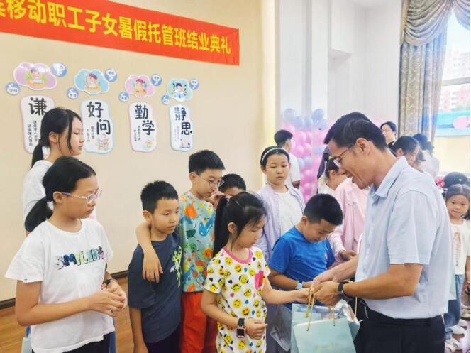 畢業(yè)典禮現(xiàn)場(chǎng)充滿童趣與溫情,哈爾濱移動(dòng)工會(huì)主席為每個(gè)孩子送上了一份開學(xué)禮物并發(fā)表致辭,回顧了托管期間的點(diǎn)點(diǎn)滴滴。他提到,本次托管班圍繞“安全、快樂(lè)、成長(zhǎng)”三大核心,不僅為孩子們安排了作業(yè)輔導(dǎo)、興趣拓展、趣味運(yùn)動(dòng)等活動(dòng),還讓孩子們?cè)谳p松氛圍中收獲知識(shí)、結(jié)交伙伴、提升能力。