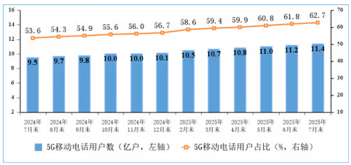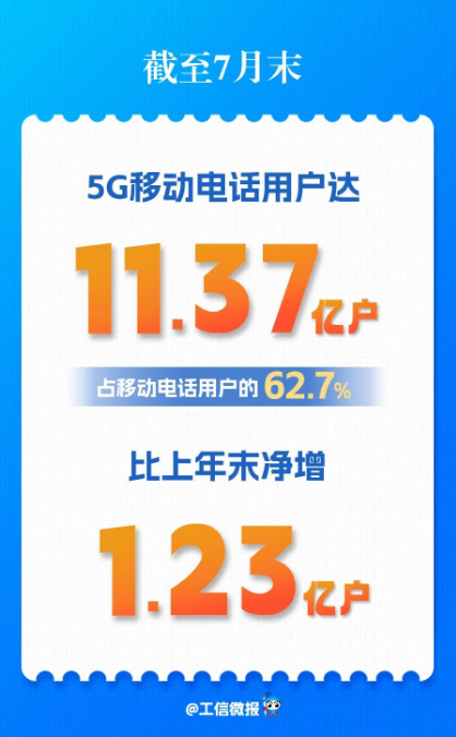 5G用戶數(shù)快速增加。截至7月末,三家基礎電信企業(yè)及中國廣電的移動電話用戶總數(shù)達18.15億戶,比上年末凈增2508萬戶。其中,5G移動電話用戶達11.37億戶,比上年末凈增1.23億戶,占移動電話用戶的62.7%。