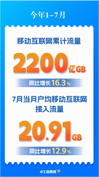 移動互聯(lián)網(wǎng)流量保持較快增長,7DOU值處于高位。前7個月,移動互聯(lián)網(wǎng)累計流量達2200億GB,同比增長16.3%。截至7月末,移動互聯(lián)網(wǎng)用戶數(shù)達15.96億戶,比上年末凈增2632萬戶。7月當月戶均移動互聯(lián)網(wǎng)接入流量(DOU)達到20.91GB/戶·月,同比增長12.9%,比上年底高1.21GB/戶·月。