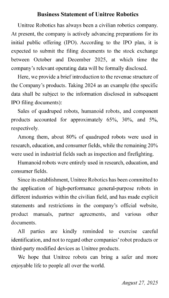 9月2日,宇樹科技在社交媒體平臺(tái)X上發(fā)帖稱,預(yù)計(jì)將在10月至12月向中國證券交易所提交IPO申請(qǐng)。 宇樹科技稱,四足機(jī)器人(20.230, 0.24, 1.20%)和人形機(jī)器人分別占2024年銷售額的65%和30%。更多細(xì)節(jié)將在IPO文件中披露。