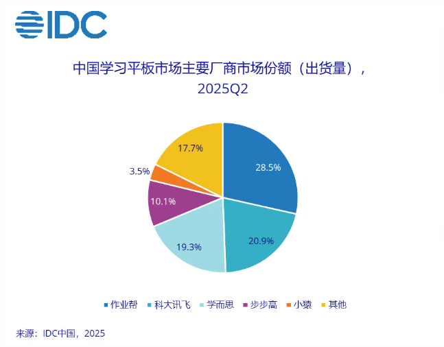 報告稱,中國學(xué)習(xí)平板市場“馬太效應(yīng)”日趨明顯,頭部廠商依托豐富的內(nèi)容資源、領(lǐng)先的 AI 能力及完善的渠道布局,不斷鞏固競爭優(yōu)勢。2025 年第二季度作業(yè)幫、科大訊飛、學(xué)而思、步步高、小猿位列市場出貨量前五,市場份額共計 82.3%。
