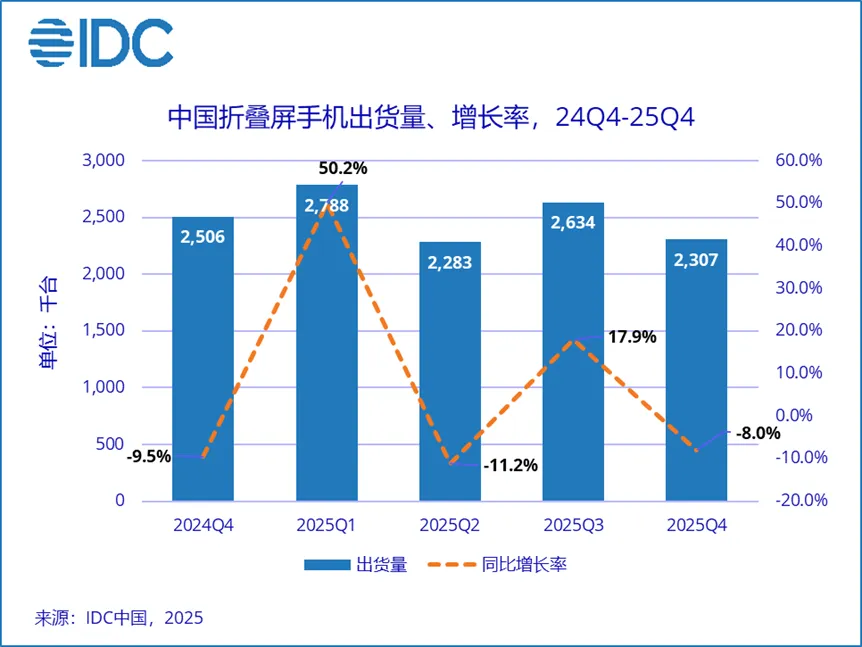 在折疊屏手機(jī)細(xì)分市場(chǎng),2025 年第四季度出貨量為 231 萬(wàn)臺(tái),同比下降 8.0%,市場(chǎng)呈現(xiàn)階段性回調(diào)。全年折疊屏手機(jī)出貨量約 1001 萬(wàn)臺(tái),同比增長(zhǎng) 9.2%,但增速已有所放緩。