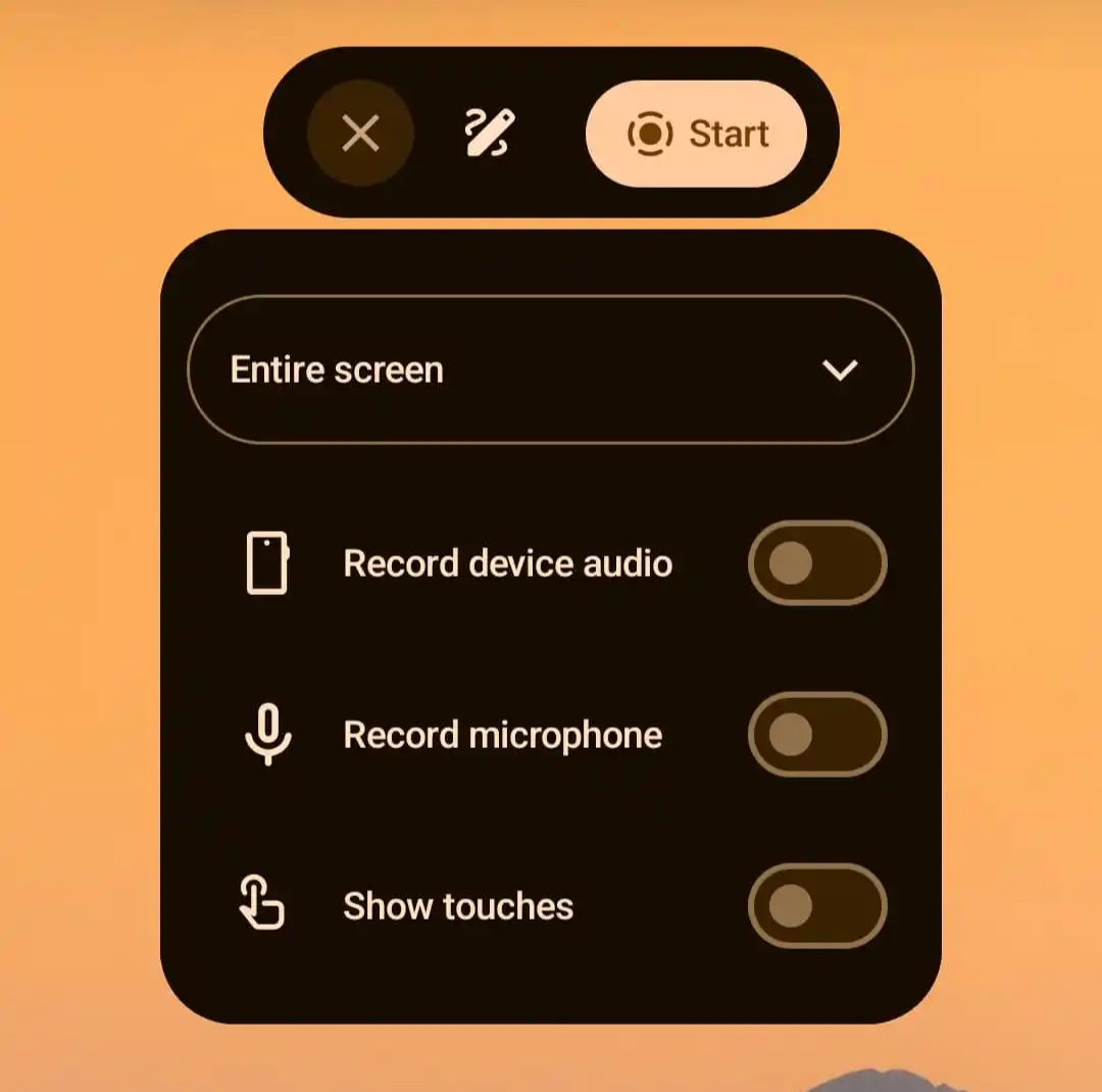 交互方面,新版錄屏工具不再以全屏彈窗形式遮擋視線,而是啟用了一個更為輕量的懸浮膠囊(Floating Pill)界面。用戶在選擇“錄制全屏”后,可快速切換錄制設(shè)備音頻、麥克風(fēng)聲音及顯示觸摸操作等選項。