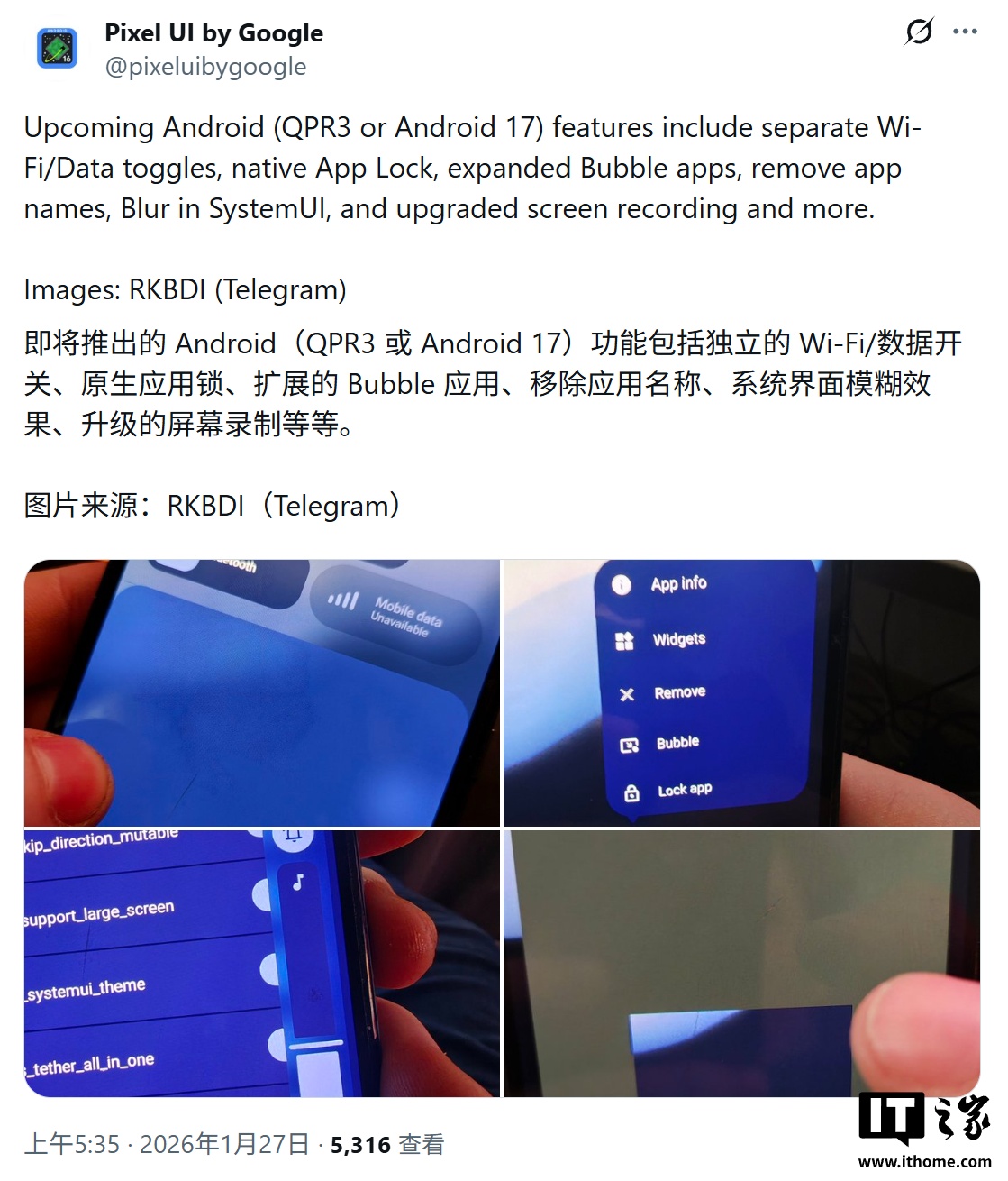 1 月 27 日消息,消息源 @RKBDI 今天(1 月 27 日)在 X 平臺發(fā)布推文,分享了一組截圖,展示了谷歌安卓 17 內(nèi)部構(gòu)建版本,聚焦 UI 視覺與功能交互上的變化。