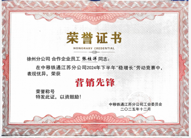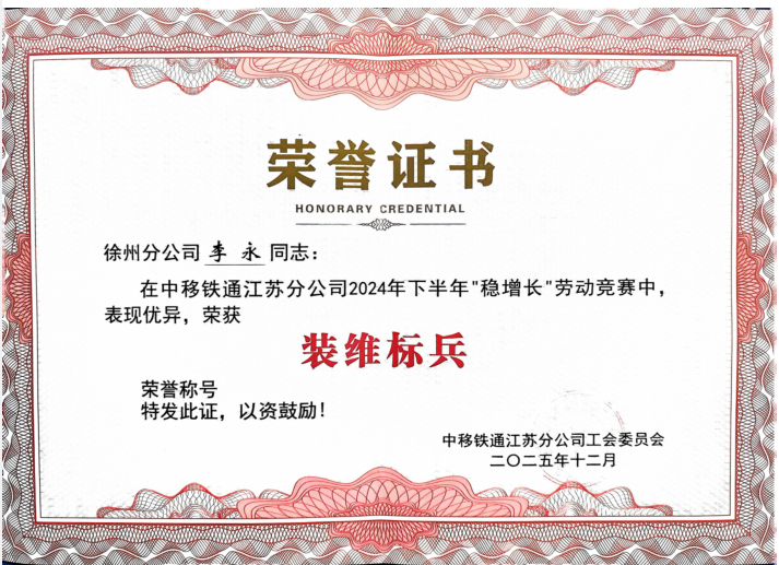 近日,從省分公司傳來捷報:在江蘇鐵通2024年下半年“穩(wěn)增長”勞動競賽中,徐州分公司員工李永、戚建分別榮獲“裝維標(biāo)兵”“工程先鋒”稱號。他們以卓越表現(xiàn)切實踐行了“淬鐵復(fù)興、創(chuàng)新向上”的企業(yè)精神,充分彰顯了“有旗必奪、有先必爭”的奮斗風(fēng)貌。讓我們以他們?yōu)榘駱,見賢思齊、接續(xù)奮斗!