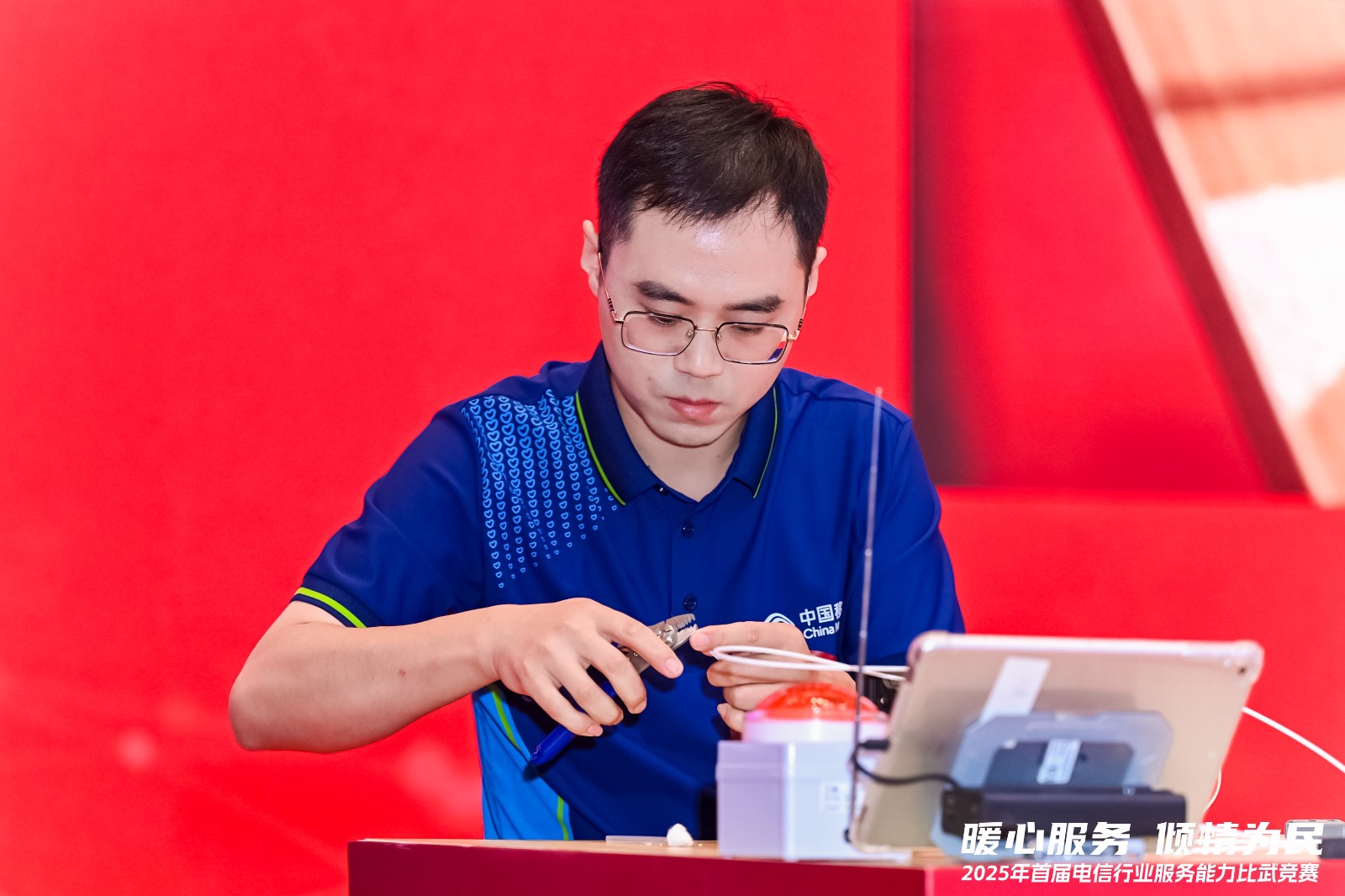 在技能競賽的戰(zhàn)場上,嚴江鋒的“自我加壓”成為團隊學習的樣板。2025年全國首屆電信行業(yè)服務能力比武競賽備戰(zhàn)期間,面對FTTR組網安裝、故障排查、智能家居調測三大核心競賽內容,他整理形成專屬“實戰(zhàn)題庫”,堅持朝九晚十的高強度實訓模式,主動將45分鐘的競賽標準時間壓縮至30分鐘進行訓練。憑借日積月累的扎實功底和賽前的刻苦備戰(zhàn),他在總決賽中僅用28分鐘便高質量完成全部三項任務,成功斬獲全國二等獎。而這只是他眾多榮譽的一個縮影,十年間,他先后拿下兩次省級技能比武一等獎、2023年中國移動“賦能建功”智慧家庭裝維技能競賽個人三等獎、2024年第五屆全國電信和互聯(lián)網行業(yè)信息通信網絡線務員比賽一等獎等多項殊榮,用實力在行業(yè)賽場綻放光彩。