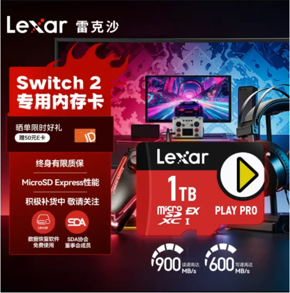 Lexar雷克沙的PLAY PRO microSD Express存儲(chǔ)卡則是專為 Switch 2量身定制的存儲(chǔ)利器。其讀取速度高達(dá)900MB/s,寫入速度600MB/s,能夠確保游戲快速加載,避免因讀取延遲影響沉浸式體驗(yàn)。容量方面提供256GB至1TB多種選擇,其中1TB版本可存儲(chǔ)約100個(gè)游戲,足以滿足資深玩家的海量存儲(chǔ)需求。