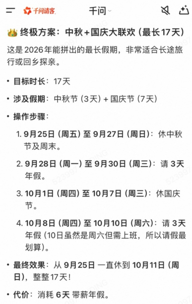 對此,千問官方表示,雖然滿足了網(wǎng)友們的請假條需求,但還是建議朋友們直面人終究還是要上班的現(xiàn)實。如果實在不想上班,還可以嘗試將今年中秋、國慶假期和年假拼成17天超長假期,實現(xiàn)從9月25日到10月11日連休17天的“拼好假”。